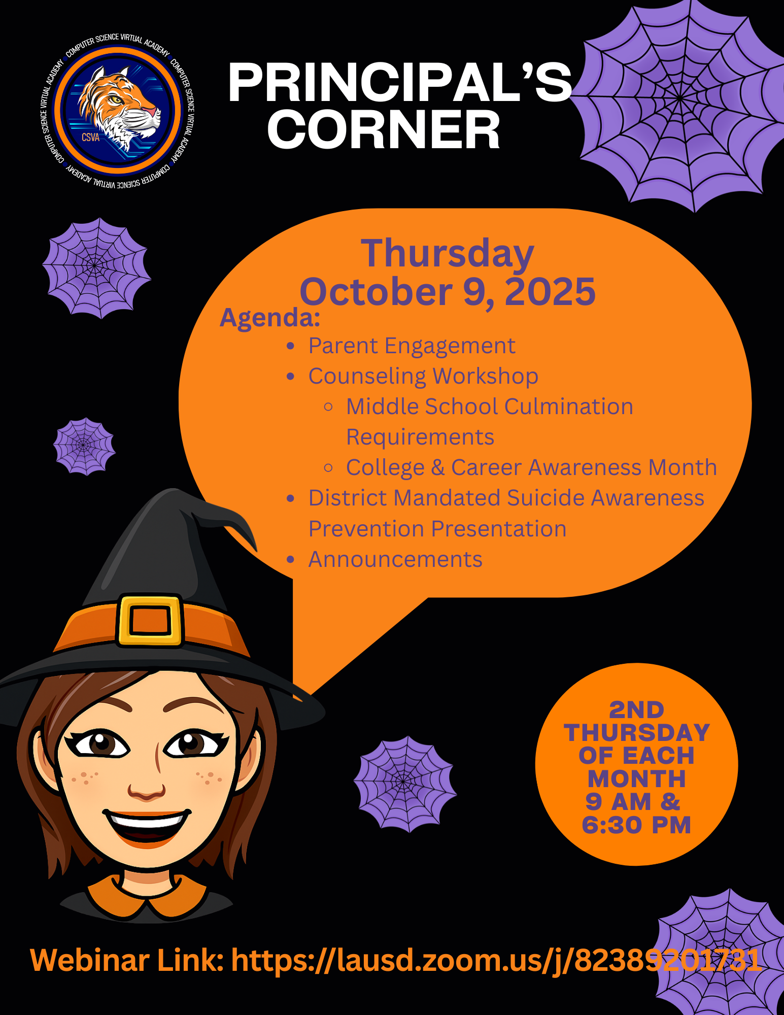 Principal's Corner Join Us for Principal's Corner Live presentation at 9:00 AM Recorded presentation at 6:00 PM Click the link to join: Webinar Link: https://lausd.zoom.us/j/82389201731