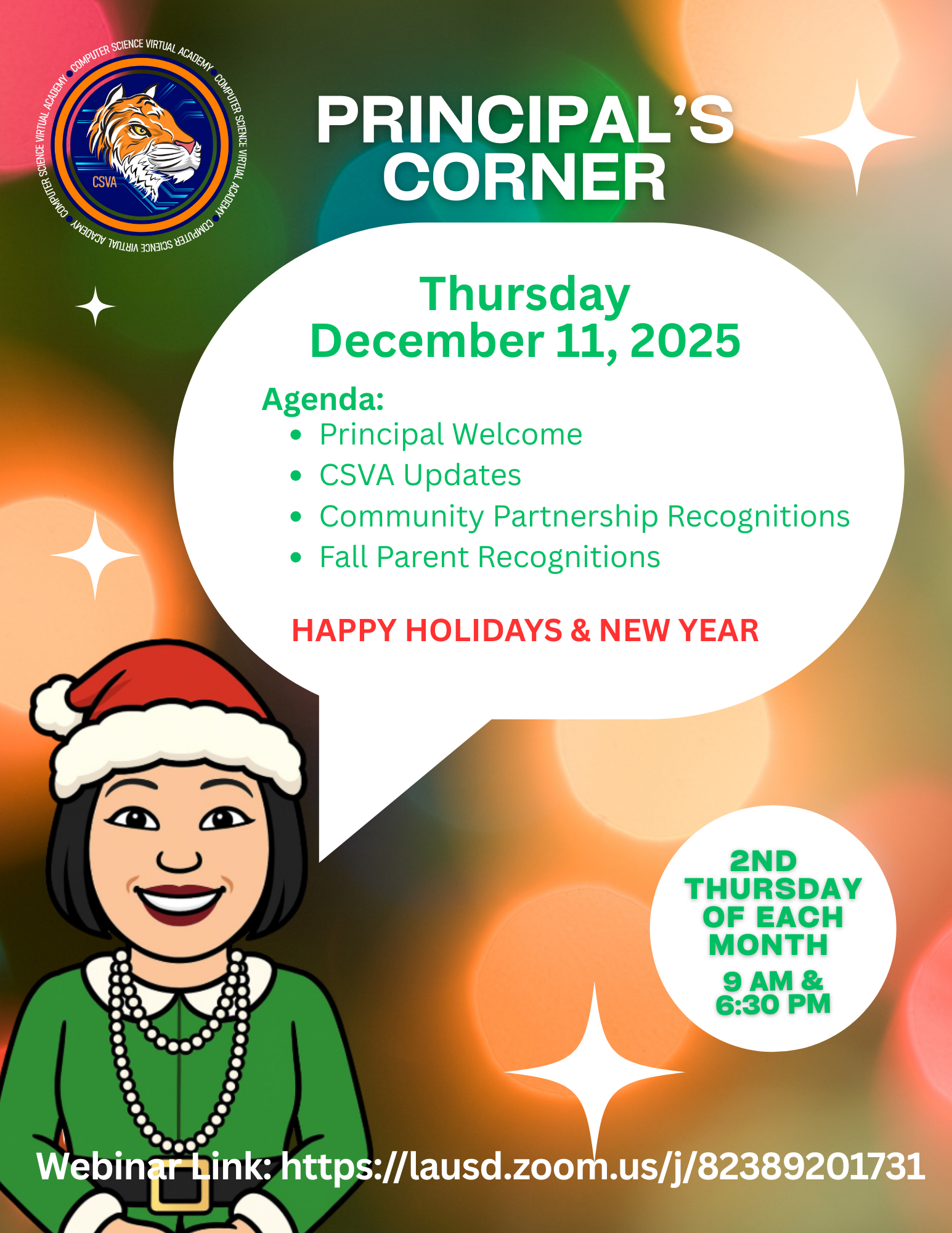 Principal's Corner Join us for the last Principal's Corner of the year as we celebrate our BSAP community partners and CSVAs parent and guardians Click link to join: https://lausd.zoom.us/j/82389201731